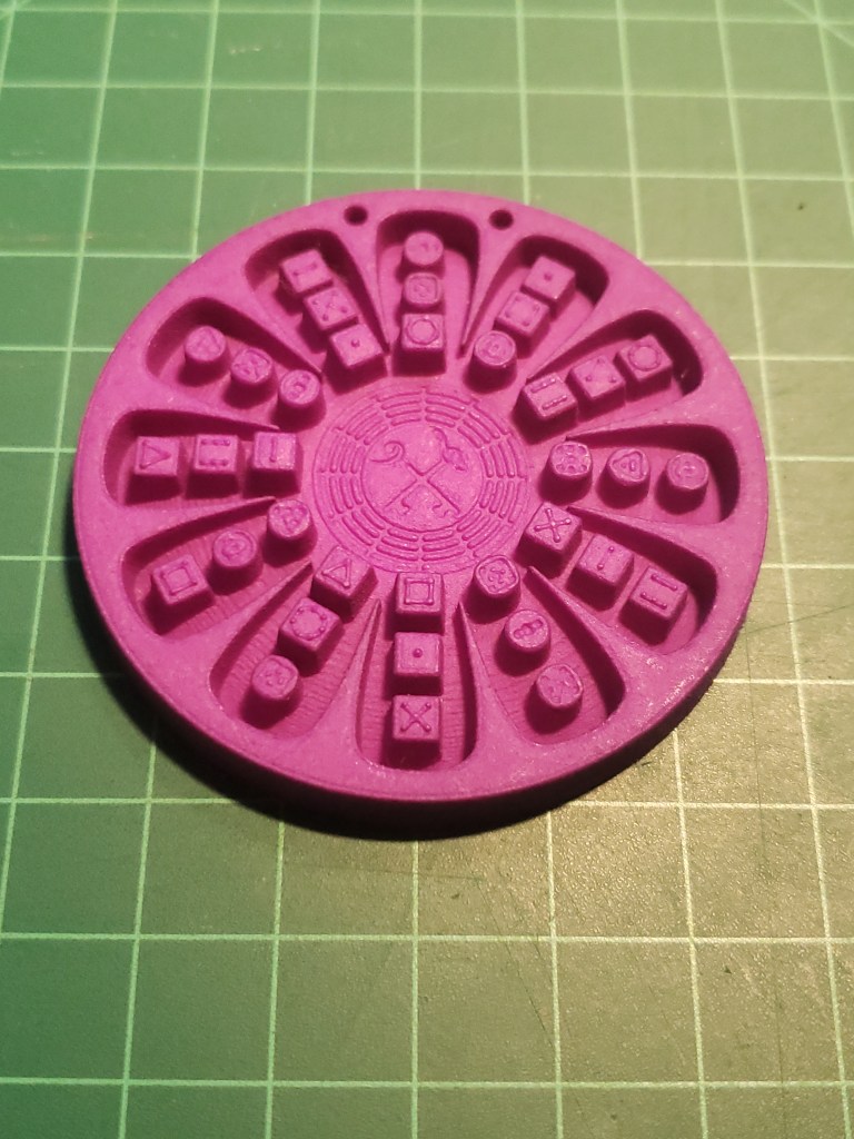 The symbols on the talisman represent musical notes, each symbol being a tone from the chromatic scale, and the separate rows of symbols representing strings, in my case, the strings of a guitar, separated by the interval of the Perfect Fourth. The visual language of the symbols was inspired by dots on dice.The number of dots represents the scale degrees of the diatonic scale, with lines connecting the dots to make visually distinct shapes. In the 3D model, diatonic notes (white keys in the Key of C on piano, for instance) are embossed on square bases, while non-diatonic notes (black keys in C) are engraved in circular bases.
