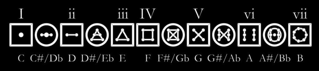 I have been fascinated with music for my entire life. At Carmel High School, I studied Music Theory with the amazing Mr. Ballantoni. He helped me understand music on a technical level that allowed me to unlock a new level of musicality in my playing and performance. I became fascinated with Arnold Schoenberg’s Twelve Tone music. Representing musical tones numerically rather than with the familiar solfege and letters opened up a new understanding for me, and soon graph paper notebooks began filling with my own music theory ideas. I converted the 12 chromatic notes into numbers, and wrote code in my graphing calculator to create sequences of notes and intervals. Later, I designed these symbols during this Talisman design project to replace the numbers.