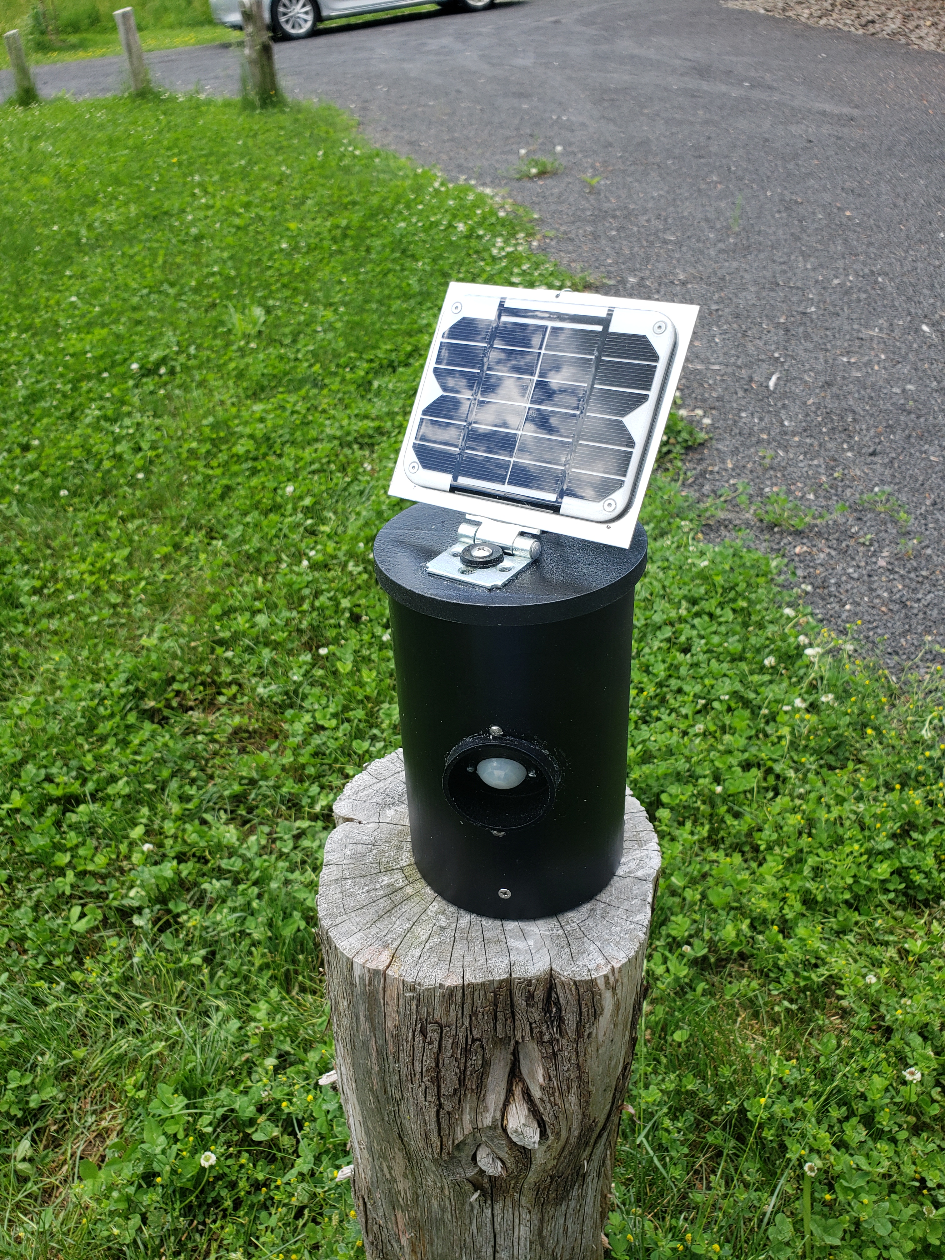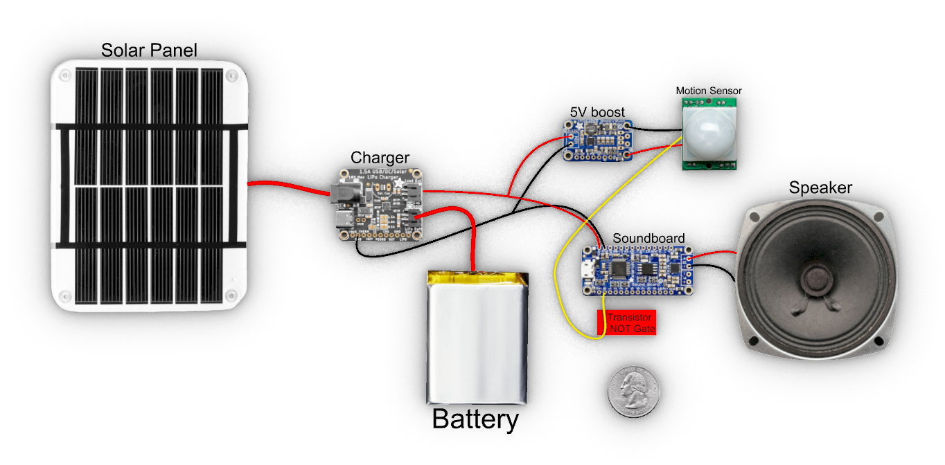 The device is powered by a solar panel and uses 3D-printed parts that were designed in Rhino and Grasshopper. The motion sensor triggers audio of a poem by Jane Hirshfield read by the artist and the sounds of extinct bird calls.
