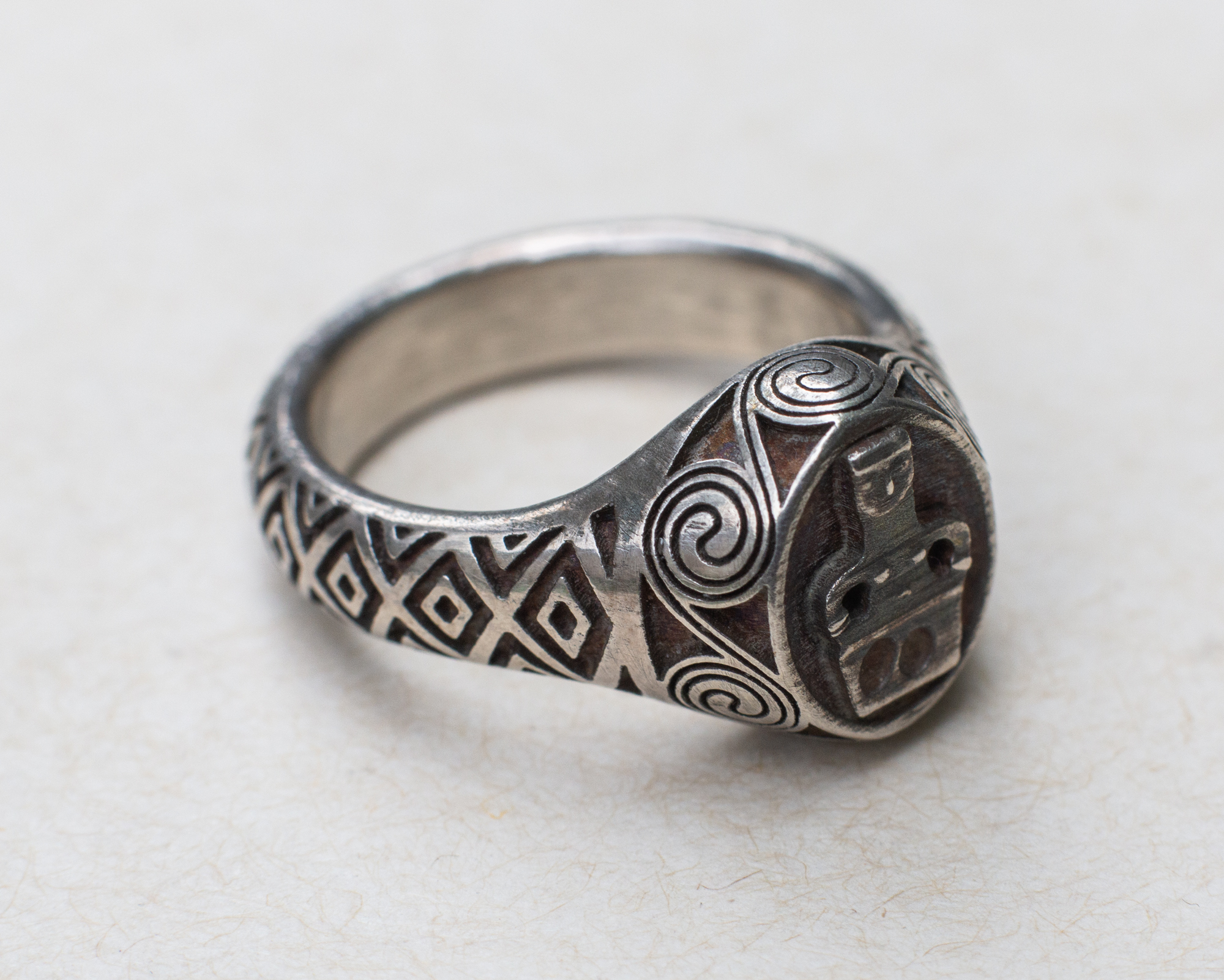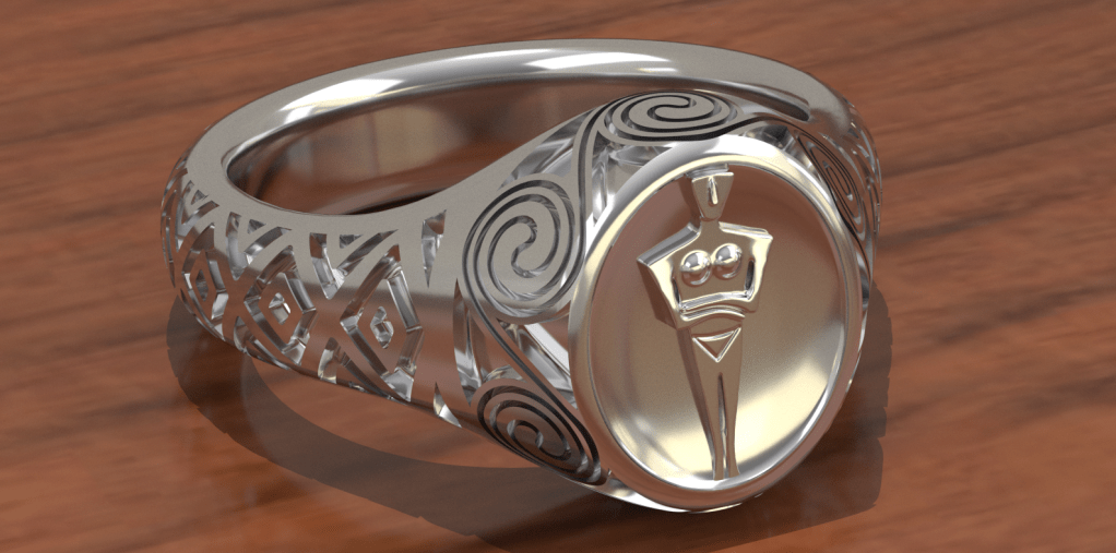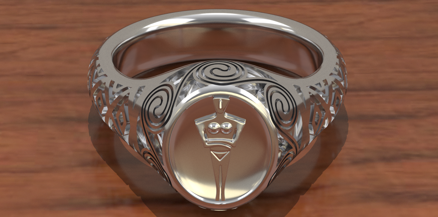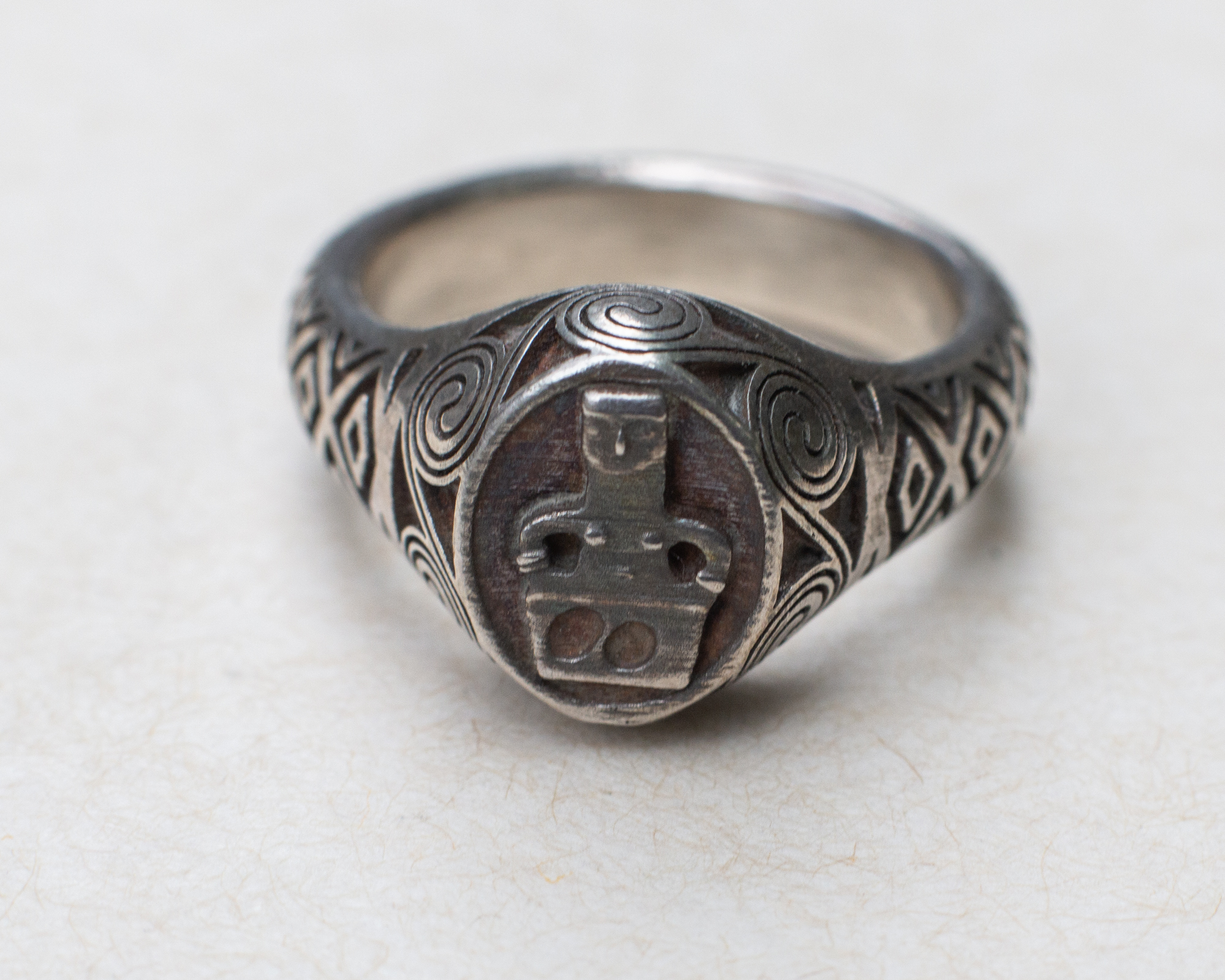 I designed this signet ring to be 3D-printed in wax on a Solidscape printer and then cast in silver. The patterns on the shank and around the signet are based on designs from the European Neolithic. The original design featured a figurine from the Cycladic islands of Greece, but I decided to use a different artifact from Porodin, Macedonia.