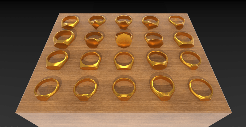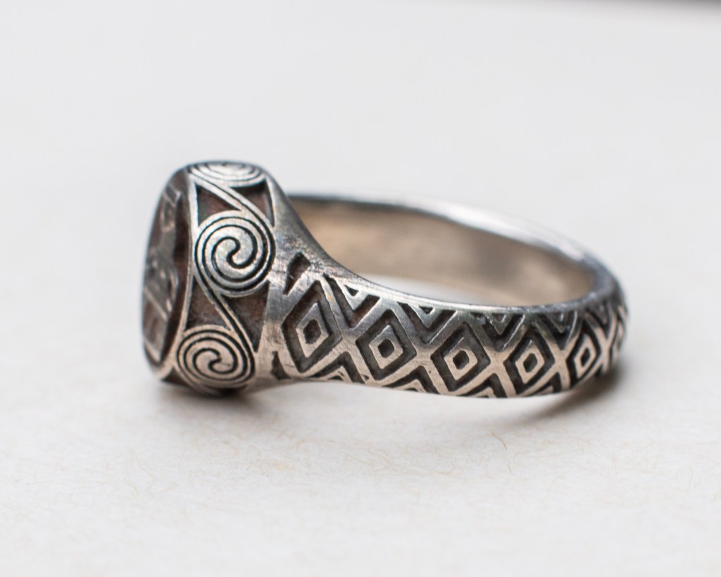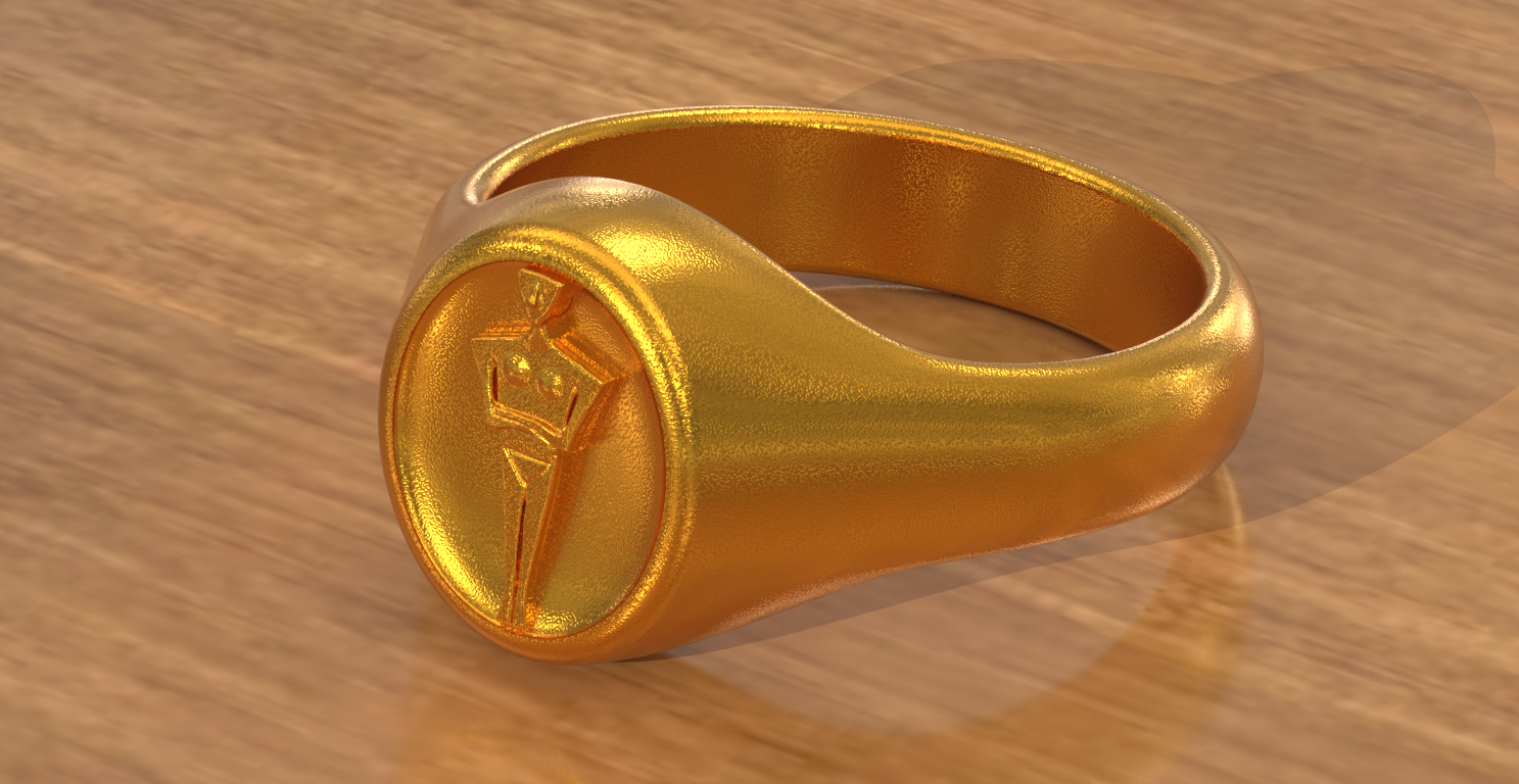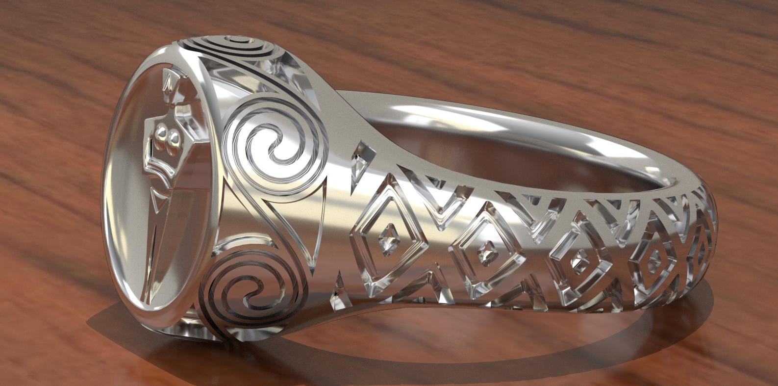 I designed this signet ring to be 3D-printed in wax on a Solidscape printer and then cast in silver. The patterns on the shank and around the signet are based on designs from the European Neolithic. The original design featured a figurine from the Cycladic islands of Greece, but I decided to use a different artifact from Porodin, Macedonia.